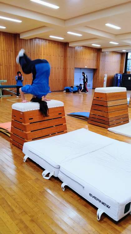 写真2 2年生「体育」男子 マット運動 女子 跳び箱 女子も「頭はね跳び」に挑戦です。