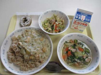 キャロットライスホワイトソースがけ かぶのスープ 焼肉サラダ 小松菜ドーナッツ 牛乳