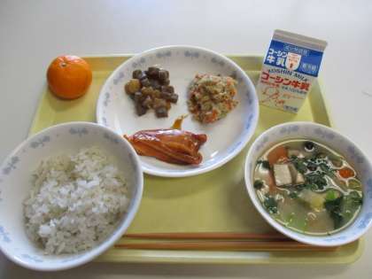 ごはん 厚揚げのみそ汁 鶏の照り焼き こんにゃくと大根の炒め物 卯の花 くだもの 牛乳