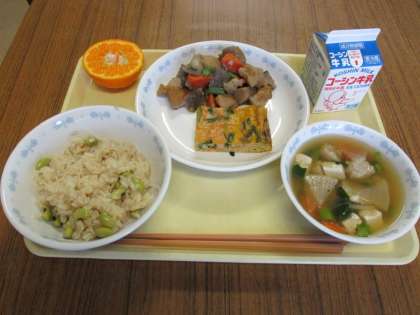 青大豆ごはん 鬼絞め(お煮しめ) あさりとにらの卵焼き いわしのつみれ汁 くだもの 牛乳