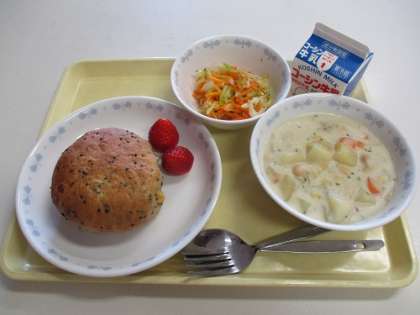 [手作り]黒ゴマチーズパン まめまめチャウダー キャロット・ラペ(人参サラダ) いちご 牛乳