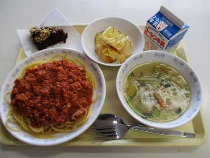 スパゲッティミートソース おさつチップス ポテトと野菜のスープ 米粉のブラウニー 牛乳