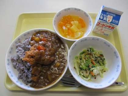合格勝カレー 竹輪入り小松菜サラダ オレンジポンチ 牛乳