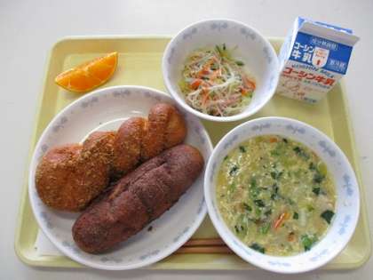 二色揚げパン(きなこ・ココア) 春雨サラダ 中華風コーンスープ でこぽん 牛乳