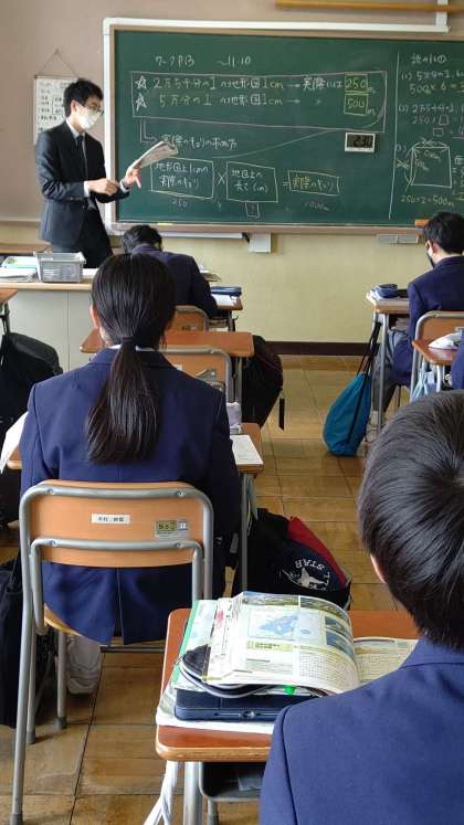 写真3 2年生「社会」地理 地形図の読み取り 地図を読み取る上での基本事項を確認します。