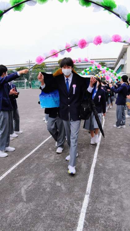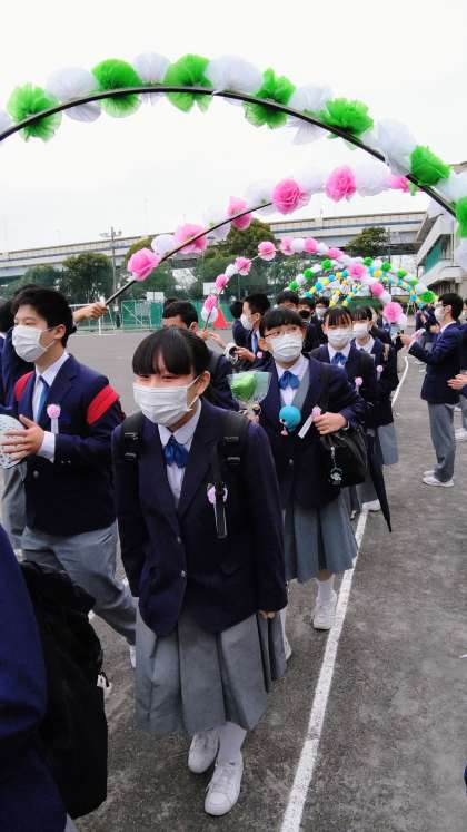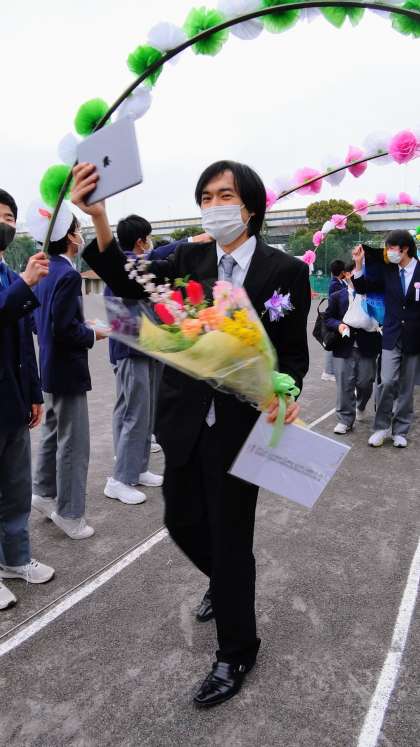 担任の小貫先生はタブレット片手に、欠席者のためのライブ配信しながらの花道です。