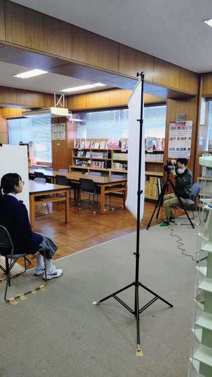 写真1 図書室にて一人ひとりの個人写真が撮られました。生徒は少々緊張した面持ちです。