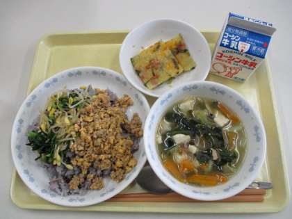 雑穀米のビビンバ もちもちじゃがチヂミ チンゲン菜と春雨のスープ 牛乳