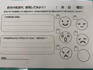 生徒の中には、自分の気持ちに気付いたり、相手に分かりやすく考えを伝えたりすることが苦手な人がいます。そのため「最近の生活でどのような出来事があったか」「その時どう感じたか」を振り返り、短い文章で表現する練習をしています。