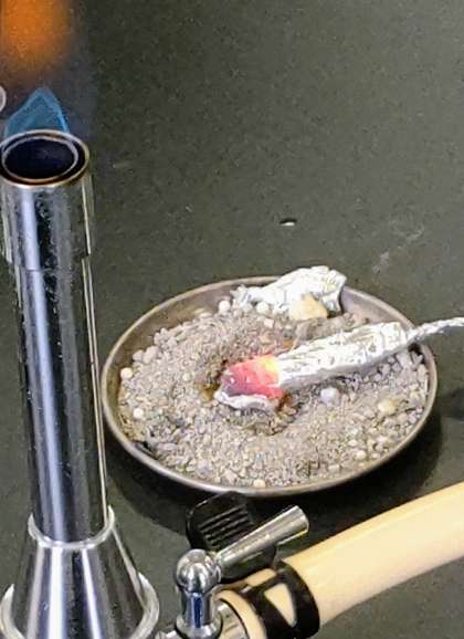 写真3 化学変化は連鎖的に進みます。ガスバーナーでの加熱を止めても、化合が進みます。化合により熱が発生するので、その熱で化学変化が連鎖します。