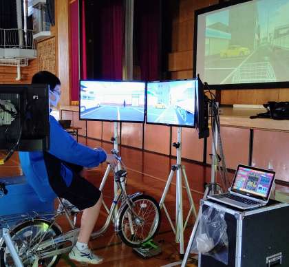 写真2 代表生徒が自転車シミュレーターを使って、道路上の危険を体験します。
