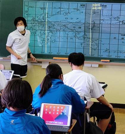 写真1 プロジェクターで地図と経度の関係を確認します。