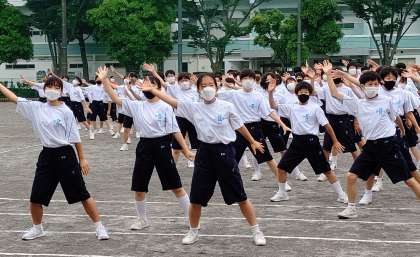 本校伝統演目のソーラン節の動きの確認です。クラス隊形から全体隊形への移行を速やか行うため、生徒個々の立ち位置を確認し、動きの確認を行いました。