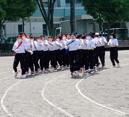 3年生「ムカデリレー」。 ( 校長 白石 亨 )