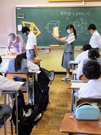 写真1 1年生「技術」 作図の基本である等角図のかき方をマスターします。