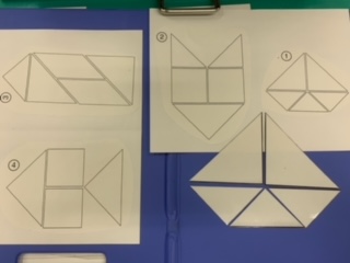 三角形や四角形、平行四辺形などさまざまな形をしたパーツを並べ、見本の形と同じ形を作る活動です。パッと見て正しく形を認識する力、どのパーツを使えばいいのか判断する力を養います。この力が身についていくことで、板書を写すことや、数学や技術で使われる図形を認識することがスムーズになっていきます。生徒達は難しそうにしながらも、楽しく活動に取り組めています。