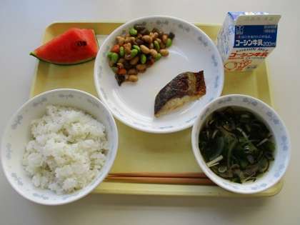 ごはん あじの黄金焼き 五目豆 もずくのすまし汁 小玉スイカ 牛乳