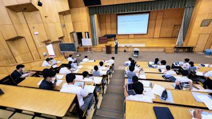 写真1 音楽の授業はレインボーホールで行われ、「土の歌」(第七楽章 大地讃頌)の鑑賞についての授業です。