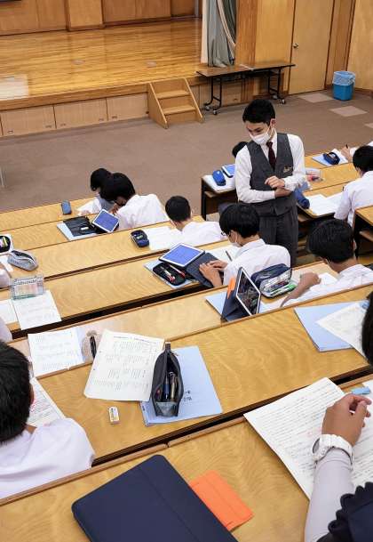 さて、本日は研究授業が行われました。先生方が一堂に会し、山口桃介先生の音楽の授業を参観しました。昨年度より導入されたiPadタブレットの活用の研究授業です。授業は3年A組で行われ、他の学年・学級の生徒は給食後に下校となりました。