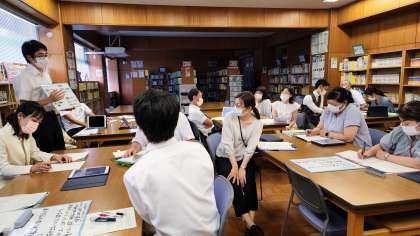写真3 授業後は図書室にて研究協議会が行われ、一層よりよい授業ができるようにと話し合いが行われました。