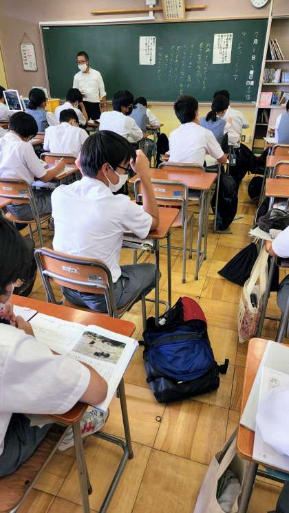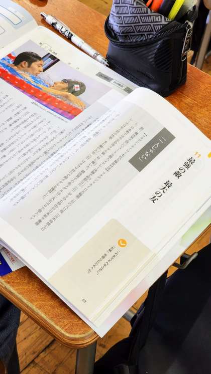 写真3 1年生「道徳」題材: 最強の敵 最大の友 【道徳的価値: 友情・信頼 高め合う友情】高い目標をもって切磋琢磨しながら高め合う大切さについて、二人の選手の心情を想像しながら考える。