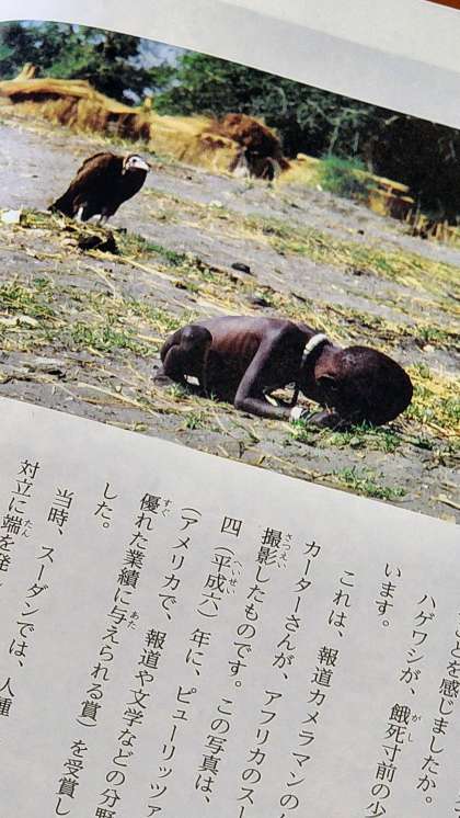 写真1・2 3年生「道徳」 題材 : ハゲワシと少女 【道徳的価値 : かけがいのない命・生命尊重】 南アフリカ共和国の報道カメラマン ケビン・カーターさんは、内線が10年以上も続くアフリカのスーダンで1枚の写真を撮る。今にもハゲワシが少女を襲おうとするその写真は世界の人々に大きな衝撃を与える。世界的に権威のあるピューリッツァー賞を受賞する。しかしそれと同時に「なぜ写真を撮る前に少女を助けようとしないのか」「人の命よりも写真が大切なのか」と大きな非難の声も・・。その後、ケビン・カーターさんは自死してしまう。1枚の報道写真から「命」について考える。