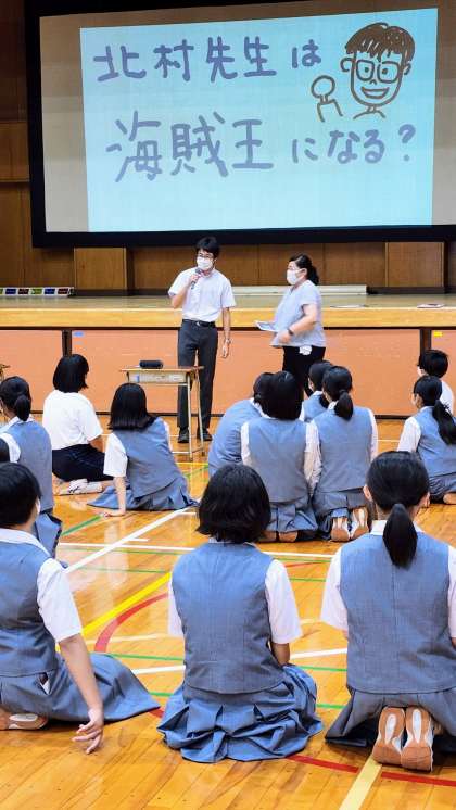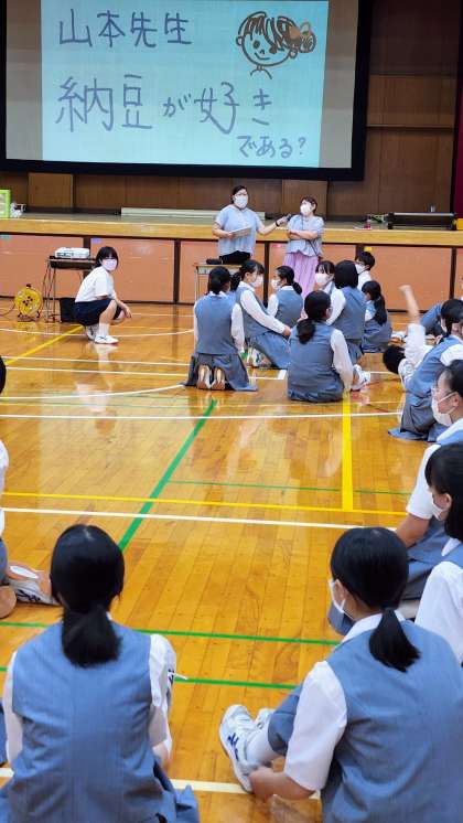 本日2年生は体育館にて林間学校の事前学習に取り組みました。7月21日から2泊3日間で訪れる茨城県についての学習です。2年生の皆さんが楽しく学べるようにと、クイズ形式での学習でした(昔あったウルトラ横断アメリカクイズのようにマル・バツで答える学習です)。