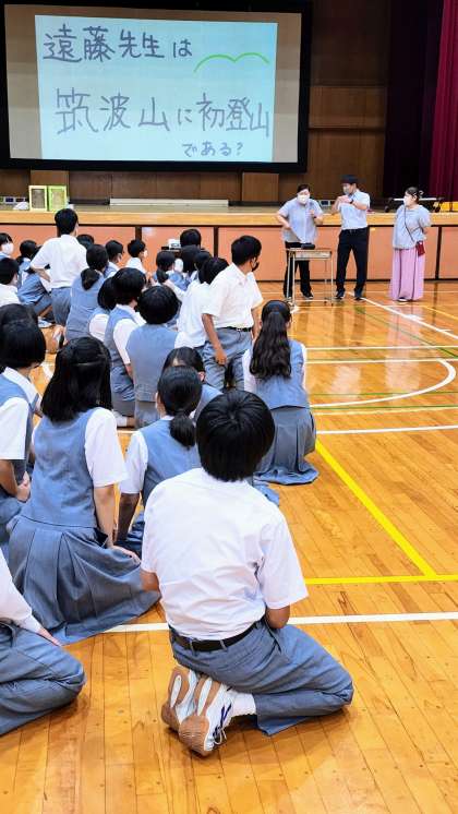 写真2 林間学校の初日は筑波山のトレッキングです。「遠藤先生は筑波山初登山か」との問題です。・・答えは「初登山」でした。
