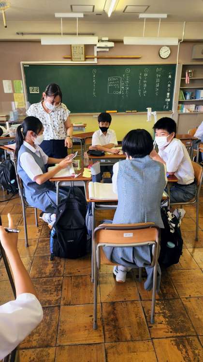 1年生の「国語」の授業では、4枚の写真からそれぞれの情報を読み取り、4枚の写真を組み合わせて一つの物語(ストーリー)を創り出す授業が行われました。創ったストーリーをグループ全員で読み、書いた作者(生徒)に感想・アドバイスを付箋で渡しました。よかった点を中心に相互にアドバイスをし合います。創造性が求められる授業でした。
