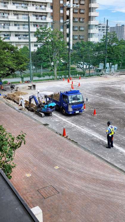 写真3 いよいよ工事が始まりました。この夏休みは、老朽化した給水管を一新する大規模工事が行われます。校舎内は約1か月間、断水状態に近い状況となります。ただし7月後半の夏季休業中の水泳教室は実施します。