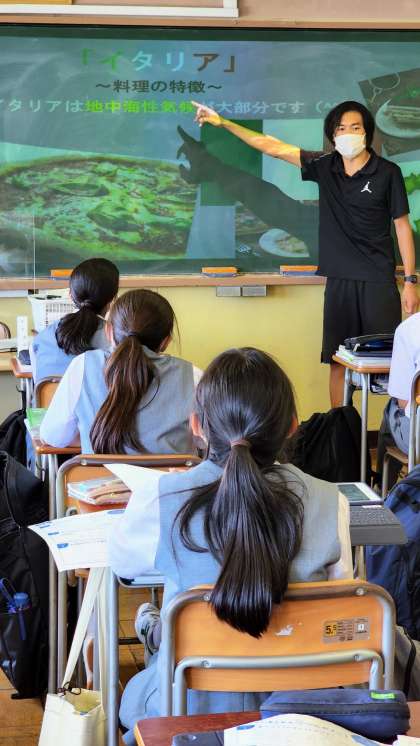 1年生「社会」地理の授業です。温暖な気候の国(地域)の料理を紹介する授業です。各グループ、パワーポイントを使って紹介します。プレゼンテーションする力を養うことを目的とします。発表する題材を考え、どうようにすれば興味をもってもらえるか、どのような内容、手順にすればわかりやすく伝えられるかを考えていきます。