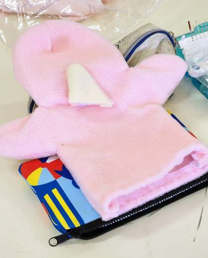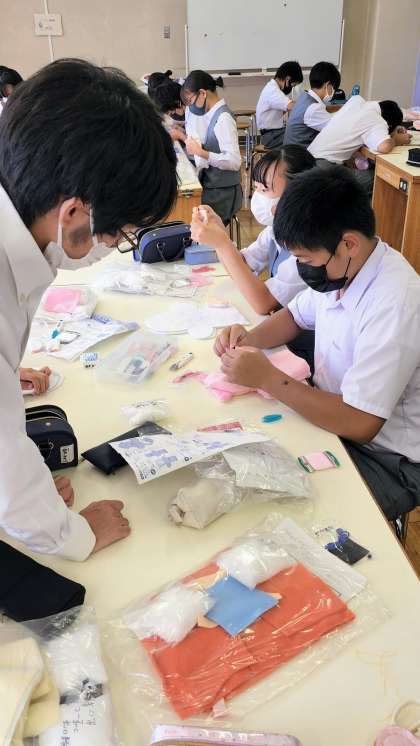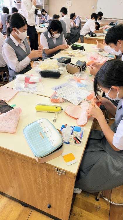 2年生「家庭」裁縫の授業です。「自分だけの おはなし指人形を作ろう!」に取り組んでいます。一人ひとりが自分だけのオリジナル指人形を作ります。色、形を自由に組み合わせ、可愛らしく楽しい指人形を作ります。ミシン掛け等の基礎操作も習得していきます。