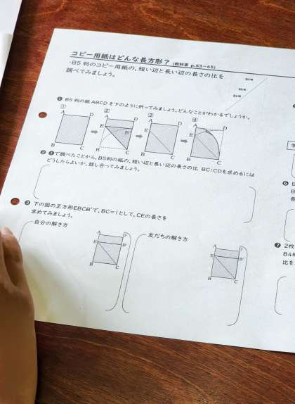 写真2 別のクラスでは、コピー用紙の「縦の長さ」「横の長さ」の比を求め、コピー用紙がどのような特徴をもつ長方形かを調べます。
