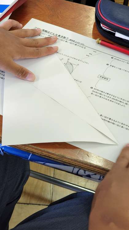 写真3 実際にコピー用紙を折り曲げながら、その特徴を調べます。体験を伴いながら学ぶことが深い理解につながります。