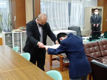 昨日の下校時、転倒して大けがをしている男性を発見した2名の男子生徒が、とっさの判断で現場の見守りと職員室への通報を行い、男性に対する早期の処置を行うことができました。2人の迅速かつ冷静な対応に敬意を表し、学校から感謝状を送りました。