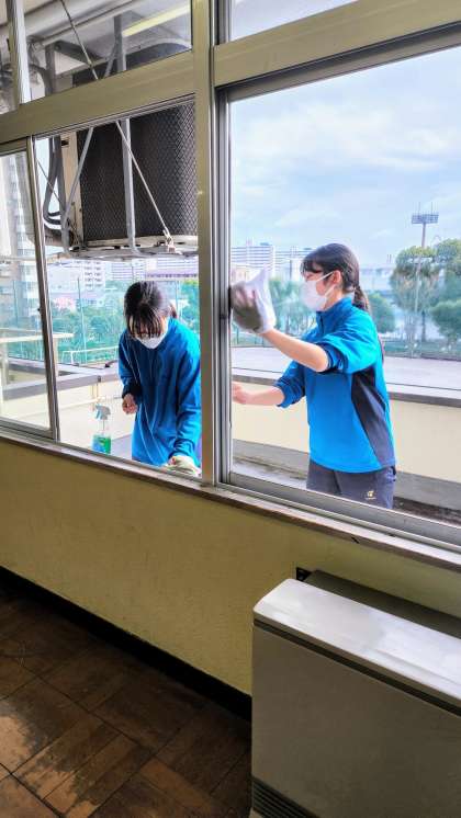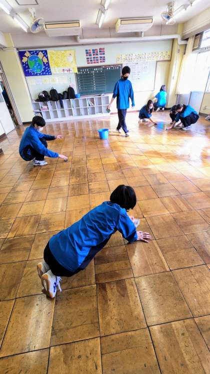 教室床の汚れは水ぶきして落とします。皆で協力して綺麗にします。窓ガラスもスッキリと綺麗に。