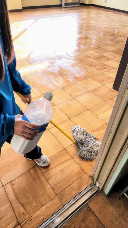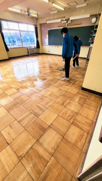 生徒が下校後、最後に各クラスの美化委員が教室のワックス掛けを行ってくれました。ご苦労様でした。明日は床がピカピカに光っていることと思います。