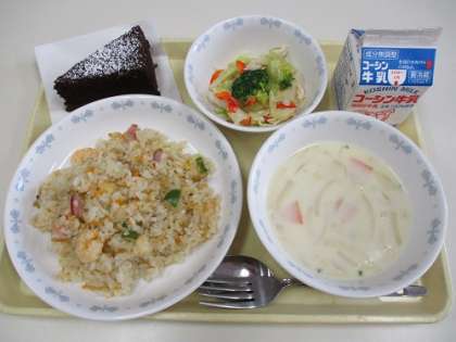 本日は2学期最後の給食でした。第1回目のリクエスト給食アンケートで大人気だった「ガトーショコラ」をデザートにして、クリスマスらしいメニューにしました。