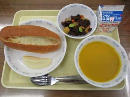 ツナじゃがドック かぼちゃの米粉ポタージュ レバーと野菜のビーンズあえ りんご 牛乳