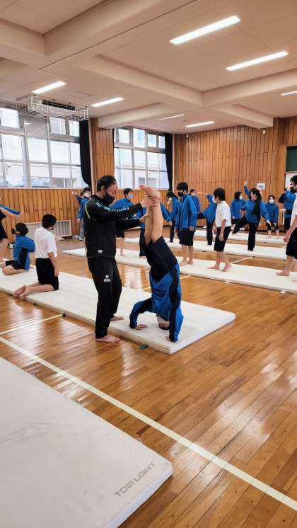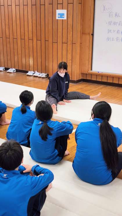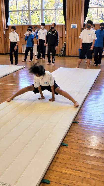 1年生の体育はマット運動に入りました。三点倒立、開脚前転等に取り組んでいます。開脚前転は難しく、なかなか立ち上がれません。