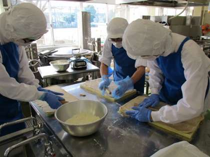 今日のメープルパンは、広げたパン生地にメープルシロップとバターを塗り、くるくると丸めてカットして作りました。職場体験3日目の2年生二人には、パン生地をのばして広げる作業を担当してもらいました。二人とも手際が良く、「次の手作りパンの日にも来てほしいくらいだね」と調理員さんからの評価も上々でした。