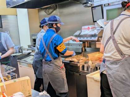 こちらは【モスバーガー西葛西北口店】です。お店の方々に混ざって遜色なく業務に当たっています。