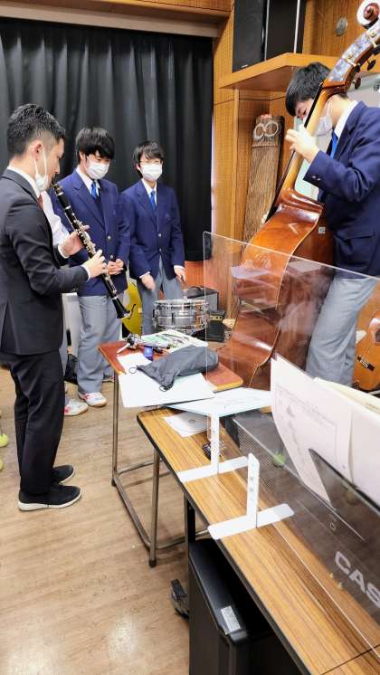 生徒は入試本番を迎えるところですが、授業の方にも頑張っています。3年生 音楽では「悲しみのラッキースター」の合奏に取り組んでいます。生徒一人ひとりが思い思いの楽器を担当し、素敵な合奏になるようにと取り組んでいます。