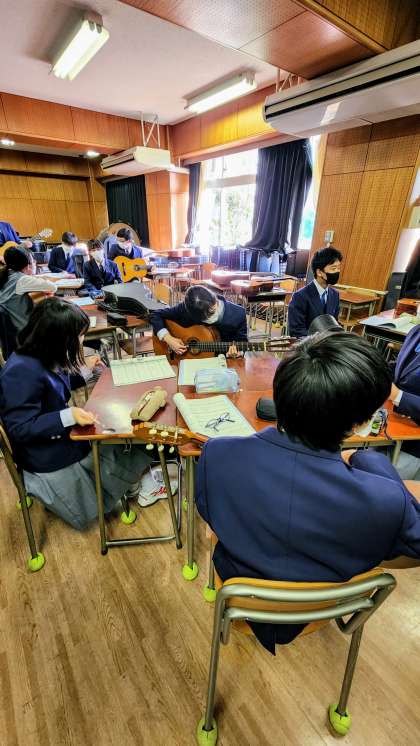 生徒は入試本番を迎えるところですが、授業の方にも頑張っています。3年生 音楽では「悲しみのラッキースター」の合奏に取り組んでいます。生徒一人ひとりが思い思いの楽器を担当し、素敵な合奏になるようにと取り組んでいます。