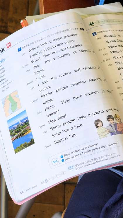 ダニエル、健、美希の3名がフィンランドについて語る場面の授業です。先生から「ムーミンのアニメを観たことありますか?」と質問したところ、観た生徒は1名だけでした。観た生徒があまりに少なくビックリです。