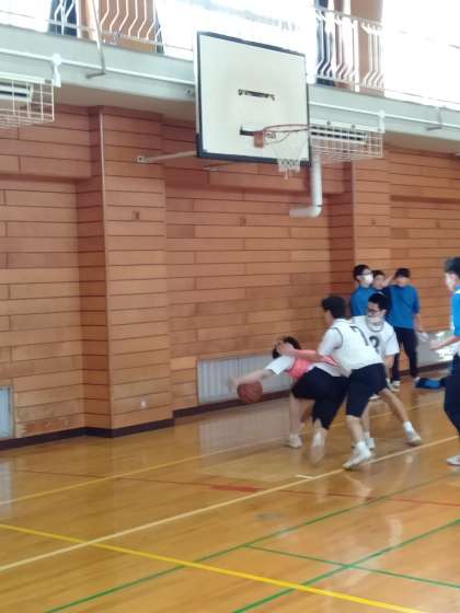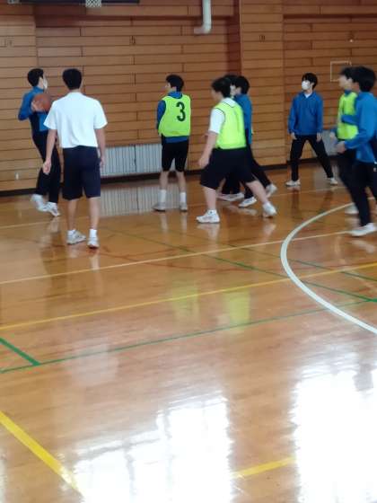 3年生の保健体育です。バスケットのゲームをしています。受験勉強で体を動かす機会が減っているため体育の授業は貴重な機会です。生徒の皆さんは笑顔でゲームを楽しんでいました。