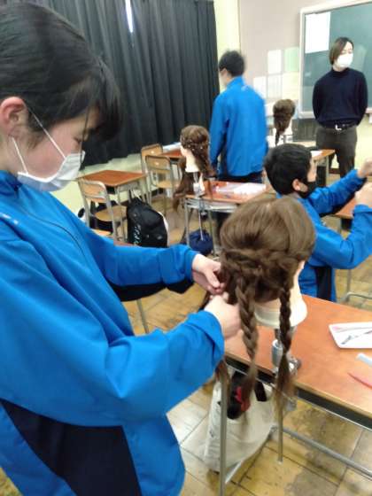 美容師科についてです。美容師になりたい人が通う学校の仕組みや授業の内容などの講話を聴いた後、実際にヘアデザインについて体験しました。全員がかわいい三つ編みをマスターしました。女子は難しい三つ編みのデザインにも挑戦しました。