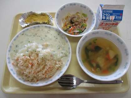 キャロットライスホワイトソース 焼肉サラダ かぶのスープ スイートポテト 牛乳