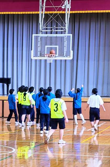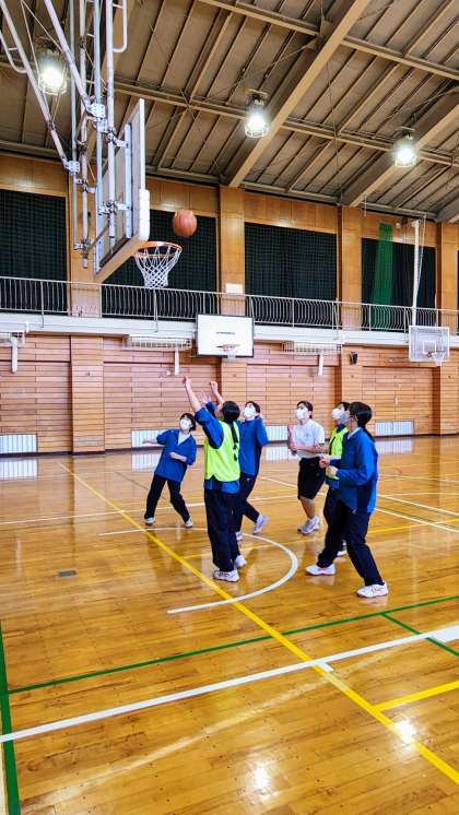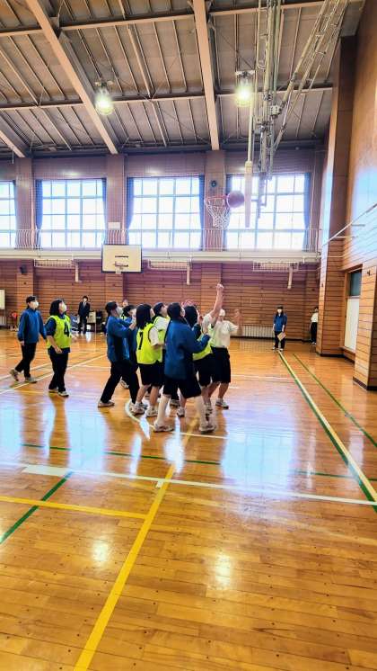 女子の種目はバスケットボールです。なかなかシュートが決まらないのですが、やっとシュートが決まると大きな歓声が上がり、仲間と笑顔で喜び合っていました。