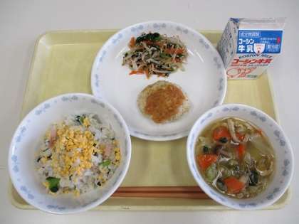 ミモザは春に黄色いポンポン状の小さな花をたくさん咲かせる木で、お花屋さんで切り花としても人気があります。イタリアでは3月8日の「国際女性デー」に、男性から女性へ、日ごろの感謝を込めてミモザの花を贈る習慣があり、この習慣は近年日本でも広がっています。今日はミモザの花をイメージした黄色い炒りたまごをごはんにのせました。ハンバーグは1年A組のリクエストメニューです。